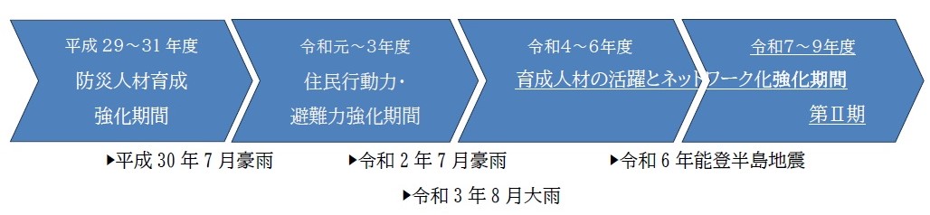・頻発化・激甚化する災害に対し、逃げ遅れによる死者・行方不明者ゼロを実現するためには、住民が災害を「自分のこと」としてとらえ、早めの避難行動を促すことが必要です。そのためには地域の防災リーダーが中心となって住民や地域の防災意識を高めることが重要であることから、『育成人材の活用とネットワーク強化期間』と位置付けました。
